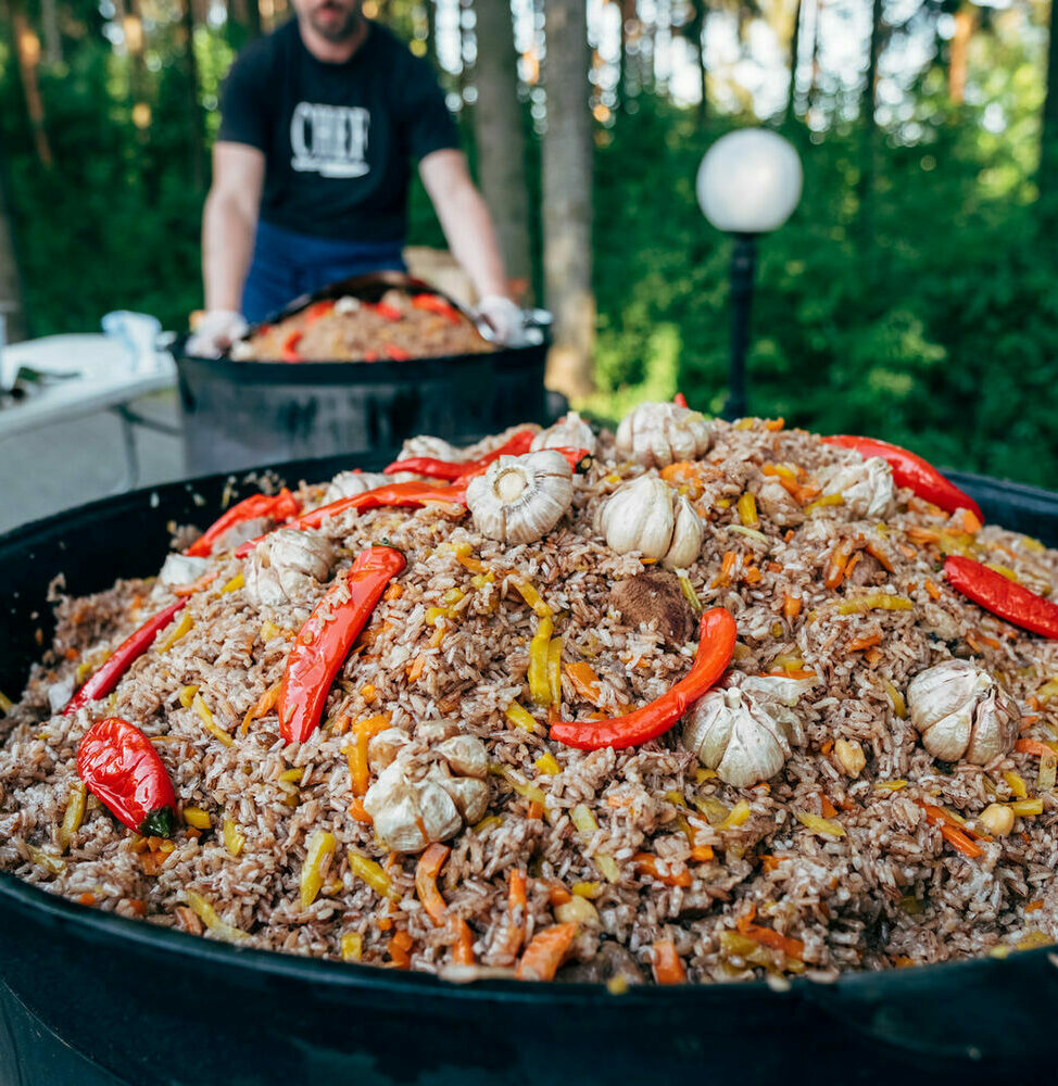 Можно заказать для больших коллективов (от 20 человек): полевая кухня (гречка с тушенкой, кулеш), плов в казане. Можно привезти всё с собой и приготовить самим - дадим казан!